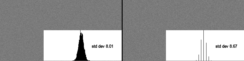 Noise of width 8 levels on the 0-255 scale was added to a uniform gray background; then the bit depth was truncated by squeezing the levels by a factor eight and then re-expanding by a factor eight. The left side of the image shows the image and its histogram before increasing the quantization step; on the right, the quantization step is made equal to the original width of the noise profile, and the standard deviation of the histogram rises by less than ten percent. More generally, in a typical image the roundoff error will vary from pixel to pixel, taking all values between plus and minus half the quantization step. Averaging the quantization error over a uniformly distributed set of input values will yield an average quantization error of about 0.3 of the quantization step. Thus, quantization error is negligible in digital imaging provided the noise exceeds the quantization step.